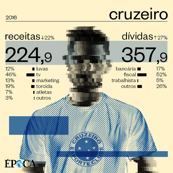 A receita celeste em 2016, R$ 225 milhões, em queda, só não foi pior porque o contrato de TV rendeu R$ 104 milhões e outros R$ 27 milhões em luvas, prêmio por assinar antecipadamente a venda dos direitos de transmissão de 2019 a 2024 para a TV Globo. As bilheterias que o time obtém com o Mineirão são a metade do que arrecadou nos anos de glórias – uma queda natural, uma vez que a equipe perdeu desempenho no Campeonato Brasileiro, não chegou à final da Copa do Brasil, como em 2014, além da crise econômica no país que tirou dinheiro dos torcedores em geral. O fato é que, mesmo com as luvas da TV e a assinatura de um novo patrocínio estatal com a Caixa, o clube não arrecada tanto quanto gasta. Aí vêm os déficits.