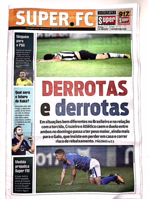 E cobrou com toda a razão os créditos da enigmática foto que publiquei no post sobre a derrota do Galo, que é do João Godinho, fera do jornal O Tempo, a quem peço desculpas por não ter citado na postagem. Esta foto foi capa de hoje no caderno SuperFC. Fred caído e literalmente derrotado, no vexame contra a Chapecoense no Independência.