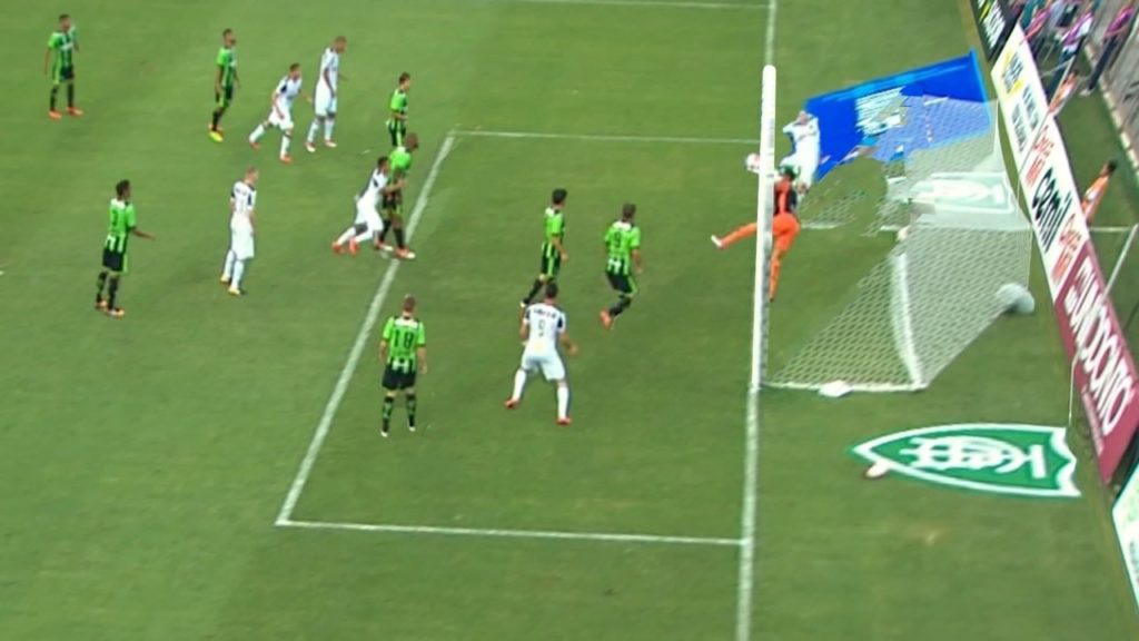 O goleiro do america fica 1 metro para dentro do Gol, e tira a bola que havia entrado.Erros sempre acontecem, a favor ou contra.O futebol insiste em ser atrasado perante outros esportes.Coloca um chip na bola e pronto, entrou está registrado.Na NFL são 5 juízes e ainda podem consultar a imagem de lances duvidosos.Na NBA 3 juízes e imagens.Na Natação tbm.E por ai vai.Ai temos de falar sobre isso e esquecer esse campeonato ridículo onde nesse jogo o público pequeno deu prejuízo aos clubes.