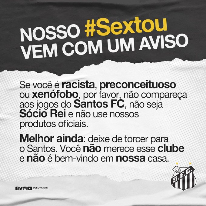 O Atlético reagiu bem contra a injúria praticada pela dupla racista infeliz, não só com a nota pública de repúdio, mas também excluindo-a dos quadros de sócio-torcedor Galo na Veia. Na vida, todo radicalismo é questionável, mas o Santos, que andou vivendo situações semelhantes, se cansou das reincidências e radicalizou, em função do caso mais recente. Foi em outubro, depois que o Thiago, do Ceará, deu entrevistas denunciando que o volante Fabinho fora vítima da imbecilidade de torcedores na Vila Belmiro, porém não percebida pela arbitragem nem imprensa. Ocorrência nem registrada na súmula do jogo. O Santos soltou a seguinte nota: @SantosFC “Se você é racista, preconceituoso ou xenófobo, por favor não compareça aos jogos do Santos FC, não seja sócio-rei e não use nossos produtos oficiais. Melhor ainda: deixe de torcer para o Santos. Você não merece esse clube e não é bem-vindo em nossa casa. Nossa arquibancada é espaço para quase todos: temos santistas de todas as raças, idades, origens, moradores de todas as partes do Brasil, gêneros, diferentes posições políticas, opções, gostos e credos. Só não temos espaço para preconceituosos”.