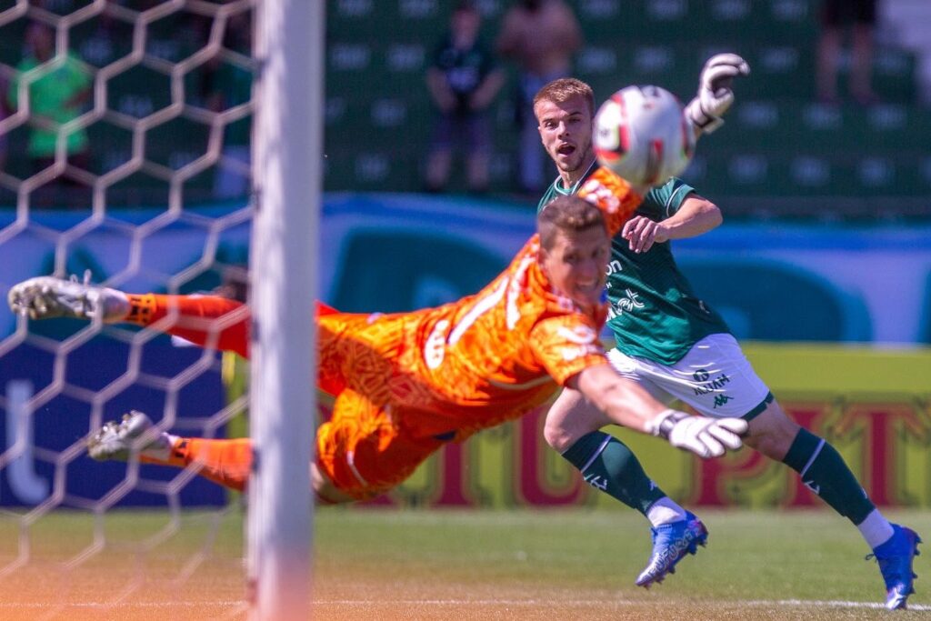 Sequência da cabeçada certeira do lateral Mateus Ludke que fez o único gol da partida.