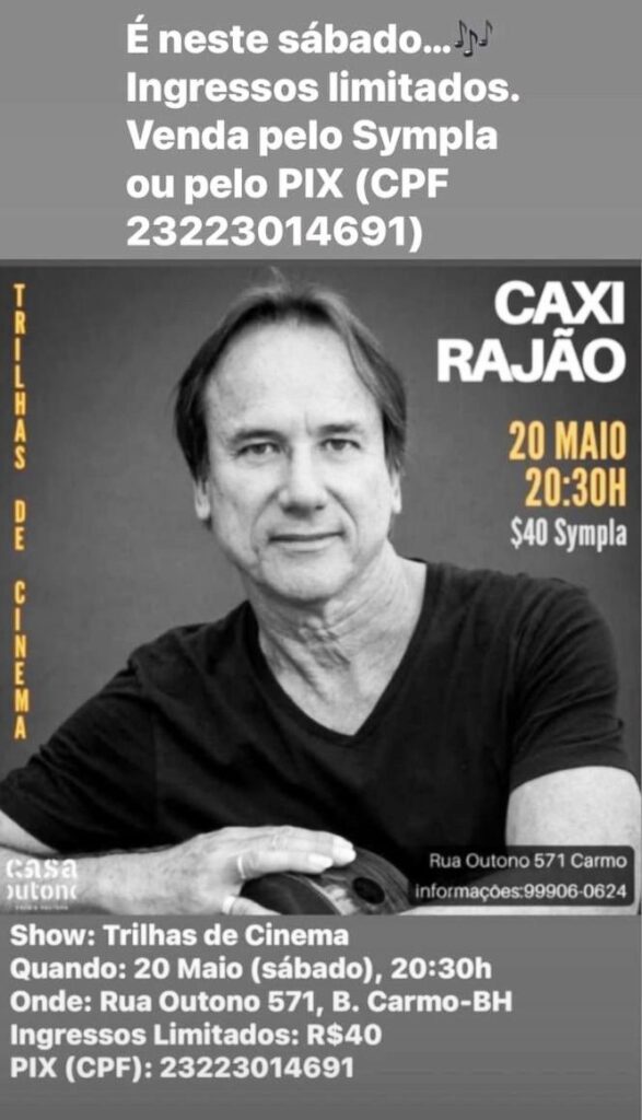 Aí para quem gosta de violão, jazz e música mais sofisticada. Meu amigo de longa, de Conceição do Mato Dentro, um dos grandes violonistas, compositores, produtor, cantor e arranjador da música popular brasileira: Carlos Xisto da Silva Rajão, o Caxi Rajão, em um repertório composto por trilhas de filmes que ele já assistiu no cinema. E […]