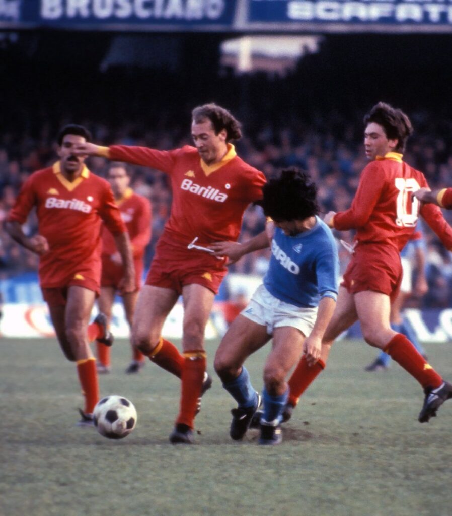 Cerezzo, Falcão e Ancelotti, marcando Maradona pelo campeonato italiano nos início dos anos 1980