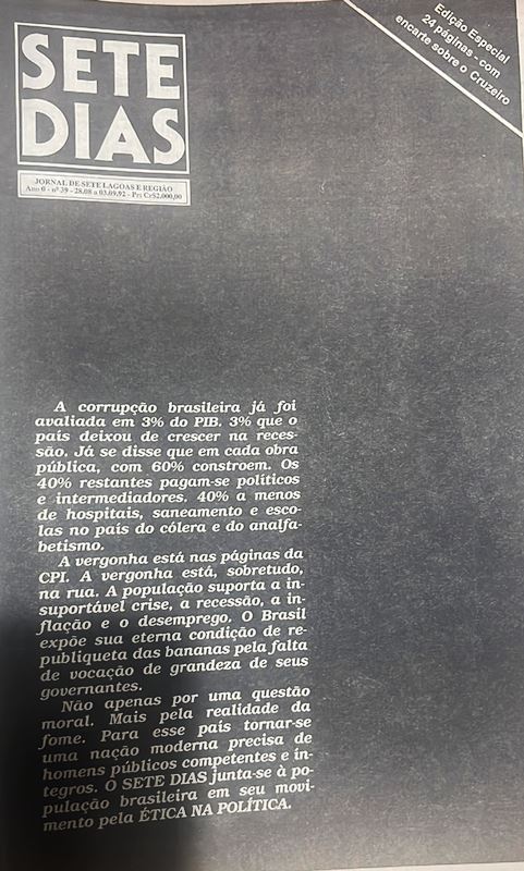 Este é o título do editorial do nosso jornal Sete Dias, de Sete Lagoas e região, que completa exatamente hoje, 34 anos de existência. Único jornal impresso a circular nessas redondezas, toda sexta-feira, ininterruptamente. Graças aos leitores que o adquirirem nas bancas e demais pontos de venda, assinantes e às empresas privadas que anunciam conosco, a quem agradeço penhoradamente. Zero de ligação com qualquer político, seja local, estadual ou federal.