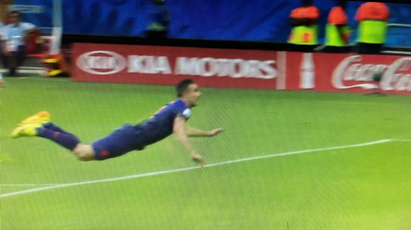 Ainda sobre Van Persie, no dia 13 de junho de 2014, no finzinho do primeiro tempo, a Holanda perdia de 1 a 0 da então campeã mundial (e uma das favoritas) Espanha, quando Daley Blind lançou de longe, no meio da zaga e ele “voou”, marcando aquele gol, cuja imagem roda o mundo até hoje.