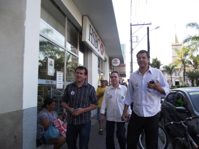 “Campanha eleitoral de 2010, em Matozinhos, onde o então presidente da CDL, Vinícius Araújo (esq,) recebia o narrador da Rádio Itatiaia, Mário Henrique “Caixa” (direita), que se candidatava a deputado estadual pelo PC do B. Entre eles, o jornalista José Luiz Gontijo, ex-Band, que trabalhou com o Caixa, na Itatiaia, e o ajudou na campanha, integrando seu gabinete na Assembleia por alguns meses.